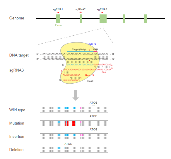 威斯腾生物根据客户需求,结合靶基因的情况进行方案定制。通常情况下,对于每个基因,我们会设计3条sgRNA,靶向切割位置靠前的外显子区域,通过细胞自身的非同源修复机制,在切割位置产生碱基的突变、插入或部分DNA序列的删除,造成错义突变、无义突变、移码突变、片段缺失,进而影响下游RNA或蛋白的功能。