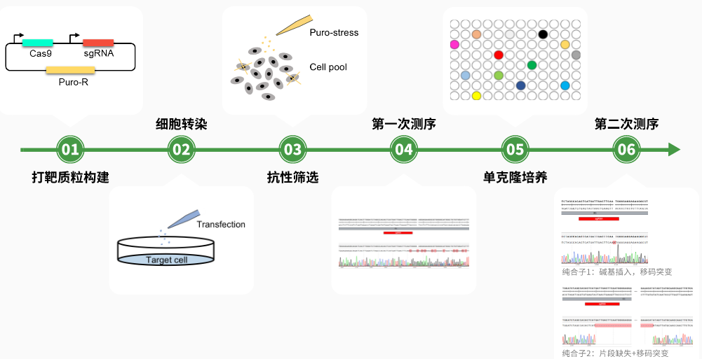 2、详尽的实验报告:包括细胞株培养信息、实验步骤;sgRNA序列及测序峰图;单克隆筛选测序验证报告。