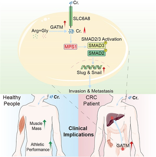 卜老师课题组近期还发现肌酸通过单极纺锤体激酶(Monopolar spindle 1 kinase, MPS1)激活Smad2/3信号通路,上调Slug/Snail的表达,促进肿瘤转移。研究人员通过原位小鼠模型发现了肌酸能够促进结直肠癌和乳腺癌的转移,并缩短荷瘤小鼠的生存期。提出了靶向肌酸合成酶GATM,肌酸转运蛋白SLC6A8及MPS1可能成为潜在的抑制肿瘤转移靶点。