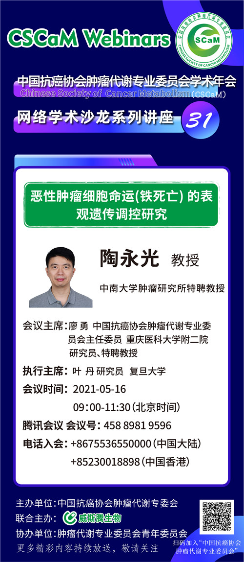 第31次的分享将在2021年05月16日早上9:00--11:30进行,来自中南大学肿瘤研究所陶永光教授将向大家分享《恶性肿瘤细胞命运(铁死亡) 的表观遗传调控研究》,赶紧关注起来吧!