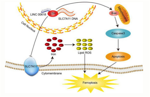 进一步研究发现LINC00618在人类白血病中的表达减少,LINC00618 通过增加BCL2的水平和半胱氨酸蛋白酶-3的裂解来促进细胞凋亡,通过增加脂质活性氧和铁水平,并减少溶质载体家族成员SLC7A11的表达来加速铁死亡。此外,LINC00618还可通过降低LSH蛋白水平,抑制SLC7A11转录,促进白血病细胞发生铁死亡。