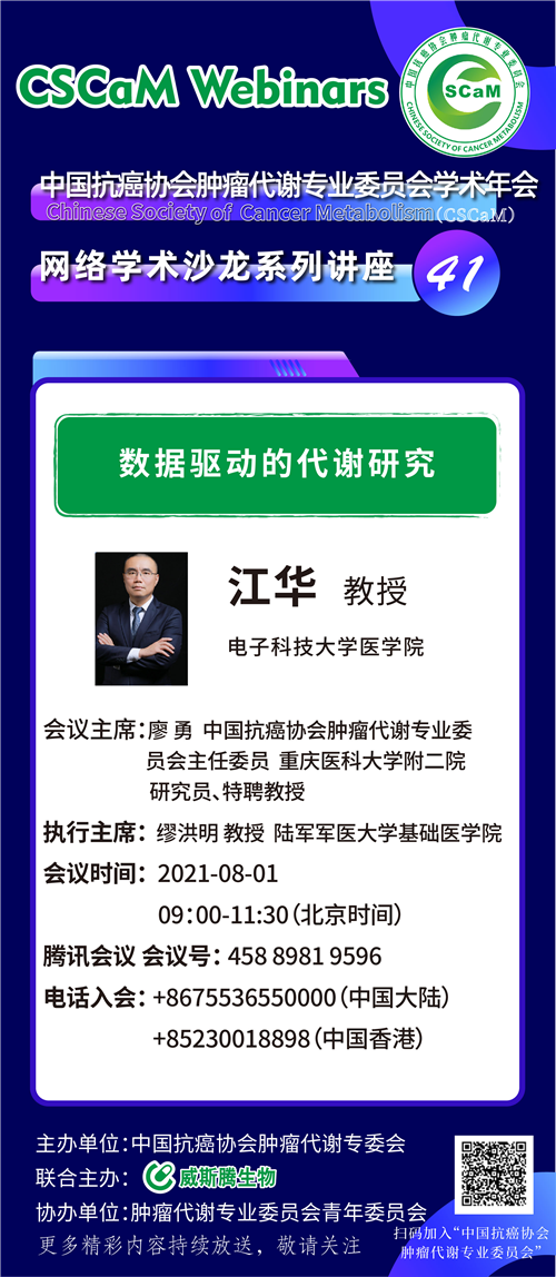 | 第41次的分享将在8月1日早上9:00--11:30进行,电子科技大学医学院江华教授将向大家分享《数据驱动的代谢研究》,赶紧关注起来吧! |
