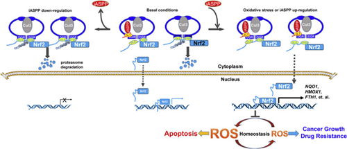 Nrf 2是主要的抗氧化剂调节因子,为了探讨iASPP介导的ROS抑制机制,进一步研究iASPP与Nrf 2信号转导的关系。研究人员利用两种独立的Nrf 2化学抑制剂抑制Nrf 2活性,结果发现iASPP失去了抑制ROS的能力,而SiRNA对Nrf 2的基因抑制作用也可阻断iASPP,这表明iASPP诱导的抗氧化作用依赖于Nrf2。