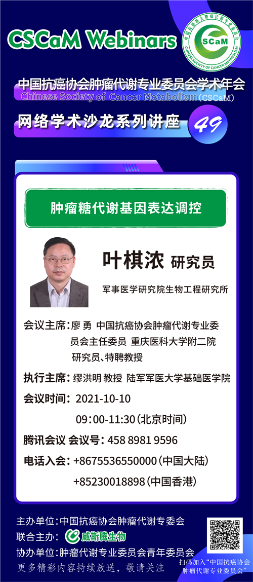 第49次的分享将在10月10日早上9:00--11:30进行,军事医学研究院生物工程研究所叶棋浓研究员,将向大家分享《 肿瘤糖代谢基因表达调控》,赶紧关注起来吧。