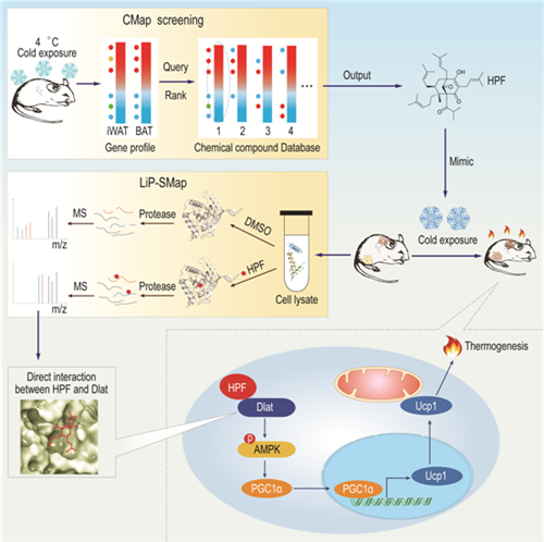 人体内主要有两大类脂肪:白色脂肪和棕色脂肪(也称米色脂肪),白色脂肪组织(White adipose tissue,WAT)可通过甘油三酯储存能量,棕色脂肪组织(Brown adipose tissue,BAT)会通过产热来消耗能量。因此,脂肪棕色化被认为与抗肥胖息息相关。此外,研究者发现白色脂肪在冷刺激下可转化为米色脂肪,以产热适应环境。当神经系统感受到外界环境的冷刺激信号后会释放去甲肾上腺素(NE),NE会靶向脂肪细胞受体β3-AR,刺激环磷酸腺苷(cAMP)合成,激活PKA,促进UCP1蛋白上调以增加产热。该过程会增加脂肪的消耗,达到抗肥胖作用。以往的研究发现西布曲明、米拉贝隆等小分子药物可促进该过程,但近几年研究表明这类小分子药物会增加患心血管疾病的风险,当前较为缺乏一种低毒有效的抗肥胖小分子药物。基于此,刘教授团队研究发现我国中药材贯叶连翘提取物——贯叶金丝桃素(Hyperforin,hpf)可不靶向中枢神经,直接靶向Dlat蛋白来促进皮下白色脂肪棕色化产热,相关研究发表在国际期刊Cell Metabolism(2021)上。