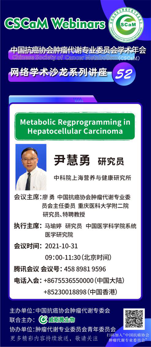 第52次的分享将在10月31日早上9:00--11:30进行,中国科学院上海营养与健康研究 所尹慧勇研究员将向大家分享《 Metabolic Regprogramming in Hepatocellular Carcinoma》,赶紧关注起来吧。