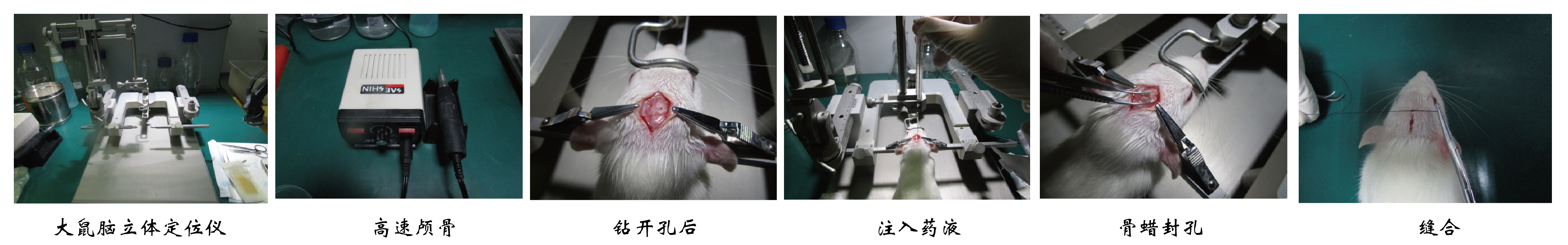 实验鼠头部备皮后固定于脑立体定位仪,头顶皮肤消毒,沿中线切开头皮,剥离筋膜,标记前囟,穿刺点位于矢状缝右旁1mm,冠状缝后1.5mm,进针深度1.5mm。高速颅骨钻于右侧脑室注射部位正上方钻穿颅骨,插入微量注射器,缓慢注入药液,注射完毕后留针数分钟,缓慢移出注射器,涂抹骨蜡,缝合外皮,完成脑定位注射。
