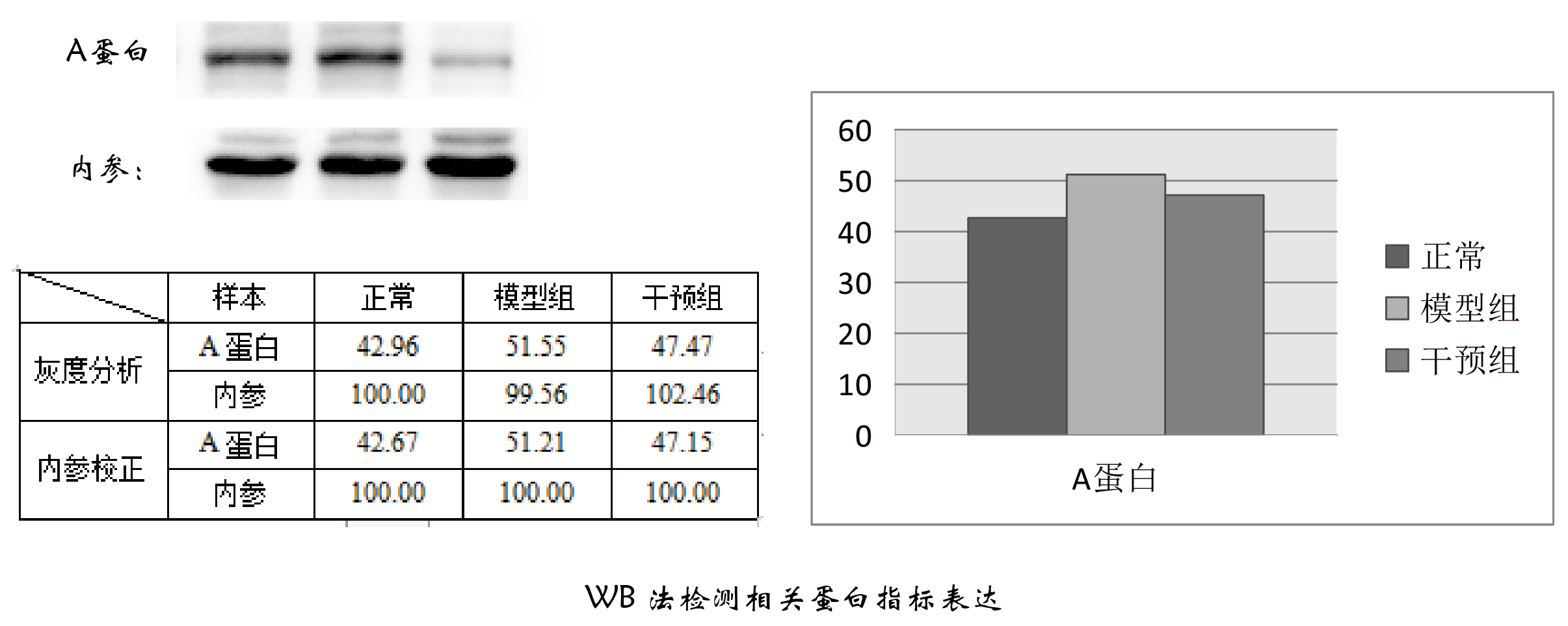 根据如下实验结果可见,与正常对照相比,A蛋白在模型组中表达增加,经过药物干预后表达降低。